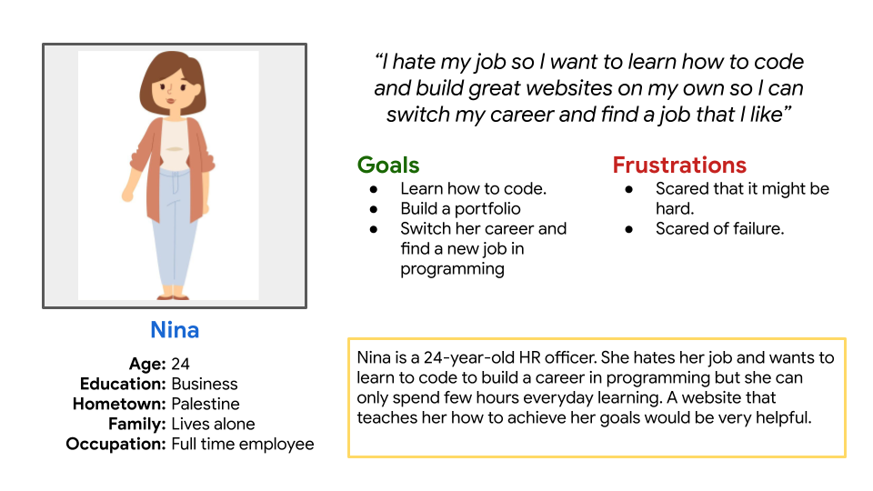 I conducted user interviews and used surveys to better understand the target users and their needs. I discovered that many target users quit learning to code after a short period of time, because they find coding hard and complicated, while other users don’t even start their path of learning due to their busy schedules.
