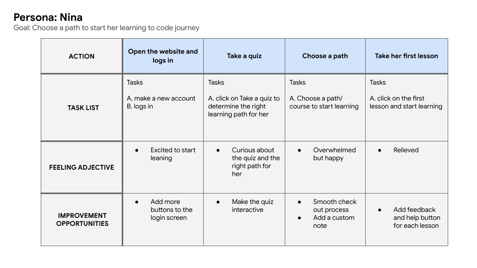 I created a user journey map of Nina’s experience using the website to help identify possible pain points and improvement opportunities.
